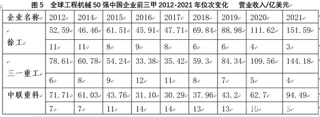筆者選取了2012-2021年中國工程機械企業前三甲在全球工程機械50強排名位次變化情況,如圖5所示,從而能側面反映我國工程機械企業在這10年間的變化。從圖5可以看出,陷入深度調整的5年,徐工2012-2014短暫位居11名,在2015年-2021年穩居10強之列,并在2021年首次躋身全球三甲。中聯重科在2015-2019年無緣前10,但2020、2021年位次大幅提升,從2020年的排名第10躍升5位,2021年位居第5。三一重工在2016、2017年短暫脫離前10,在2018年-2021年位次逐年提升,2021年排名第4名,全球市場占有率7.5%僅比第三名徐工7.9%相差0.4個百分點,但兩者與常年位居排行榜首位的卡特彼勒13%的全球市場占有率相差較大。