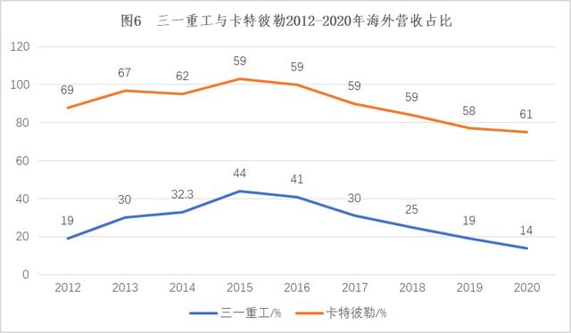 此外,筆者選取了三一重工與卡特彼勒2012-2020年海外營收占比,如圖6所示。在行業處于谷底的2015年,三一重工海外營收實現占比大幅度提高,達44%。實際上,從2012-2020年,除卻2012年、2014年和2016年三一重工海外營業收入分別為87.40億元、98.22億元和92.86億元之外,其余年份其海外收入均超過100億元,尤其在2018-2020年分別達到了136億元、141.67億元、141.04億元,占比分別為25%、19%和14%,這也充分說明其市場仍以國內為主。反觀卡特彼勒海外營收始終穩居在50%以上,2012年更是達到了69%。卡特彼勒本土化發展與海外布局疊加,使其牢牢的占據了全球工程機械的領先地位,國際化也成為卡特彼勒最顯著的基因,集銷售、生產、研發、再制造、金融服務為一體的全價值鏈服務格局的國際化策略很值得中國同行學習。而對于中國工程機械企業而言,在國內市場競爭激烈加之市場逐漸飽和的當下,海外布局如何貫徹全價值鏈體系的建設,將成為國內企業海外之路是否成功的決定性要素之一。