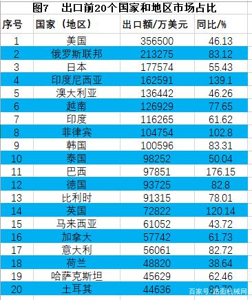 2021年,對各主要區域經濟體出口中,對韓國出口10.06億美元,同比增長83.3%;對俄羅斯出口21.33億美元,同比增長83.1%;對非洲拉美出口58.57億美元,同比增長78.6%;對歐盟出口51.52億美元,同比增長69.5%;對東盟出口63.4億美元,同比增長68.6%。上述地區在主要目標出口中增幅較大,超過總體出口增幅。對美國出口35.65億美元,同比增長46.1%。主要出口國別如圖7所示,在全球主要目標出口國中,排名前9位的國家和地區(美國、俄羅斯聯邦、日本、印度尼西亞、澳大利亞、越南、印度、菲律賓和韓國,增幅分別為46.1%、83.12%、55.43%、139.1%、46.26%、77.65%、61.62%、102.8%和83.31%),出口額均超過10億美元,占到總出口額的43.9%。出口前20個國家和地區市場占比為66.5%。